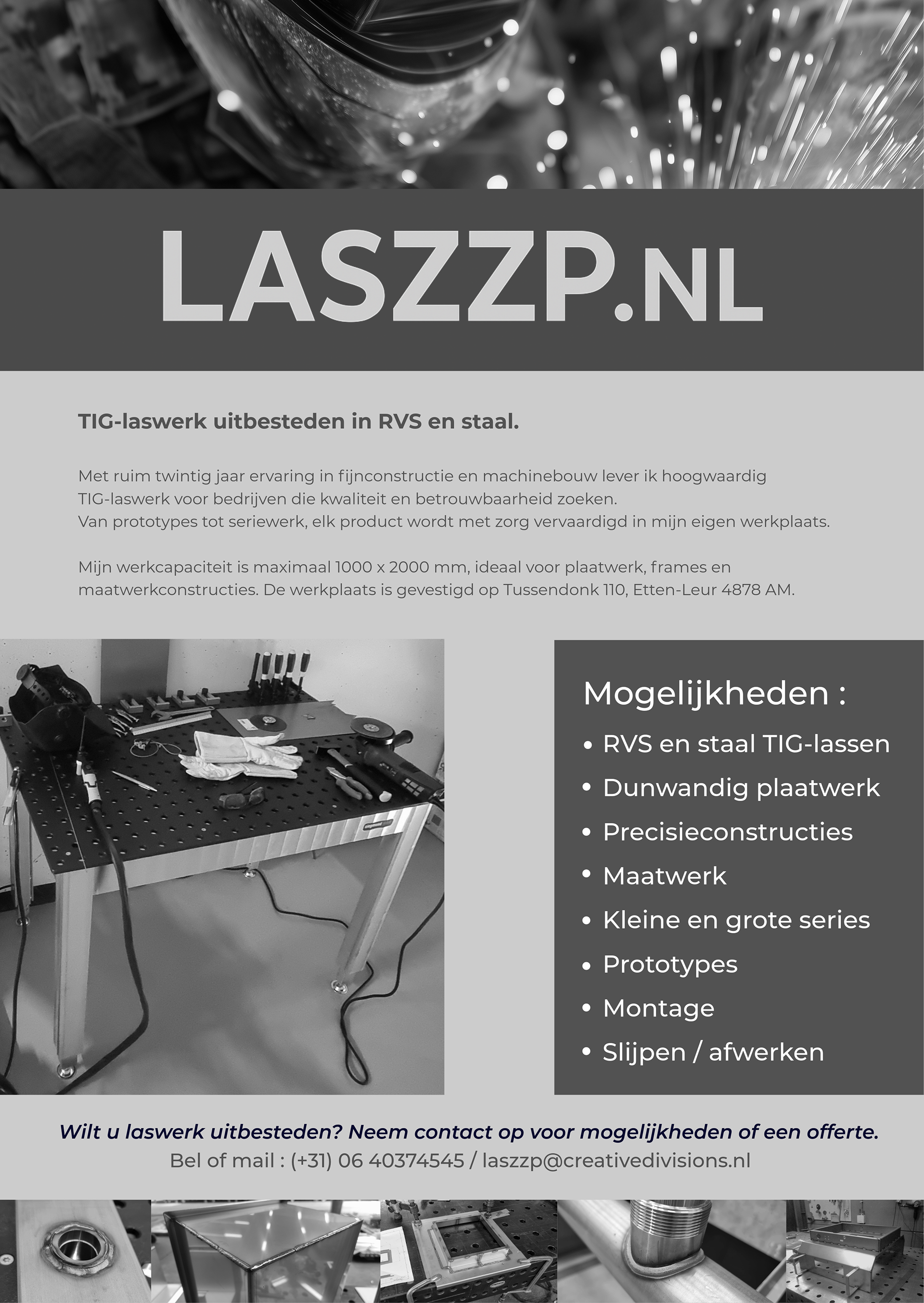 Klein laswerk in eigen werkplaats – TIG-lassen van staal en rvs, enkelstuks of kleine series.